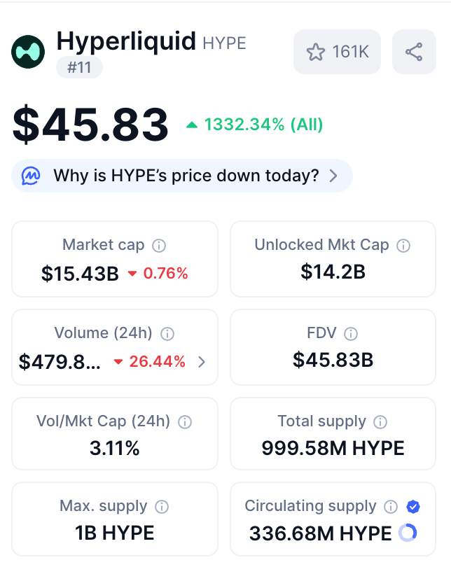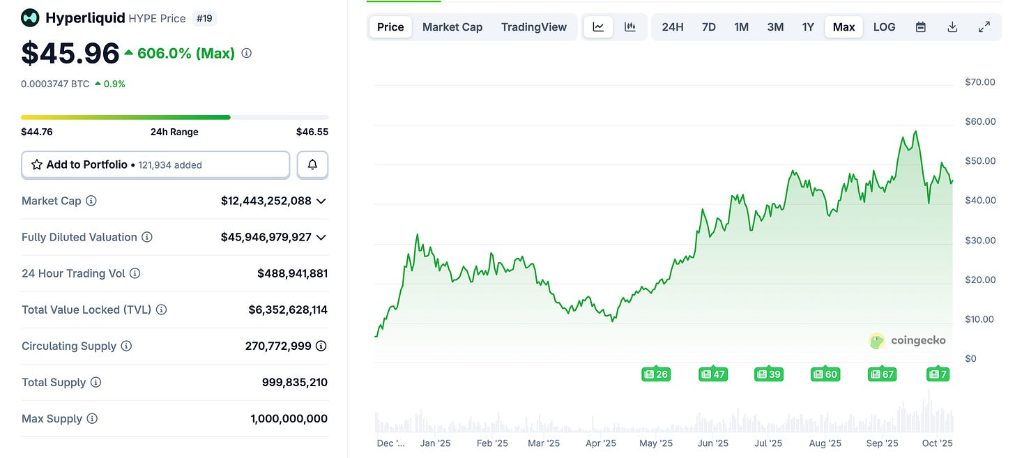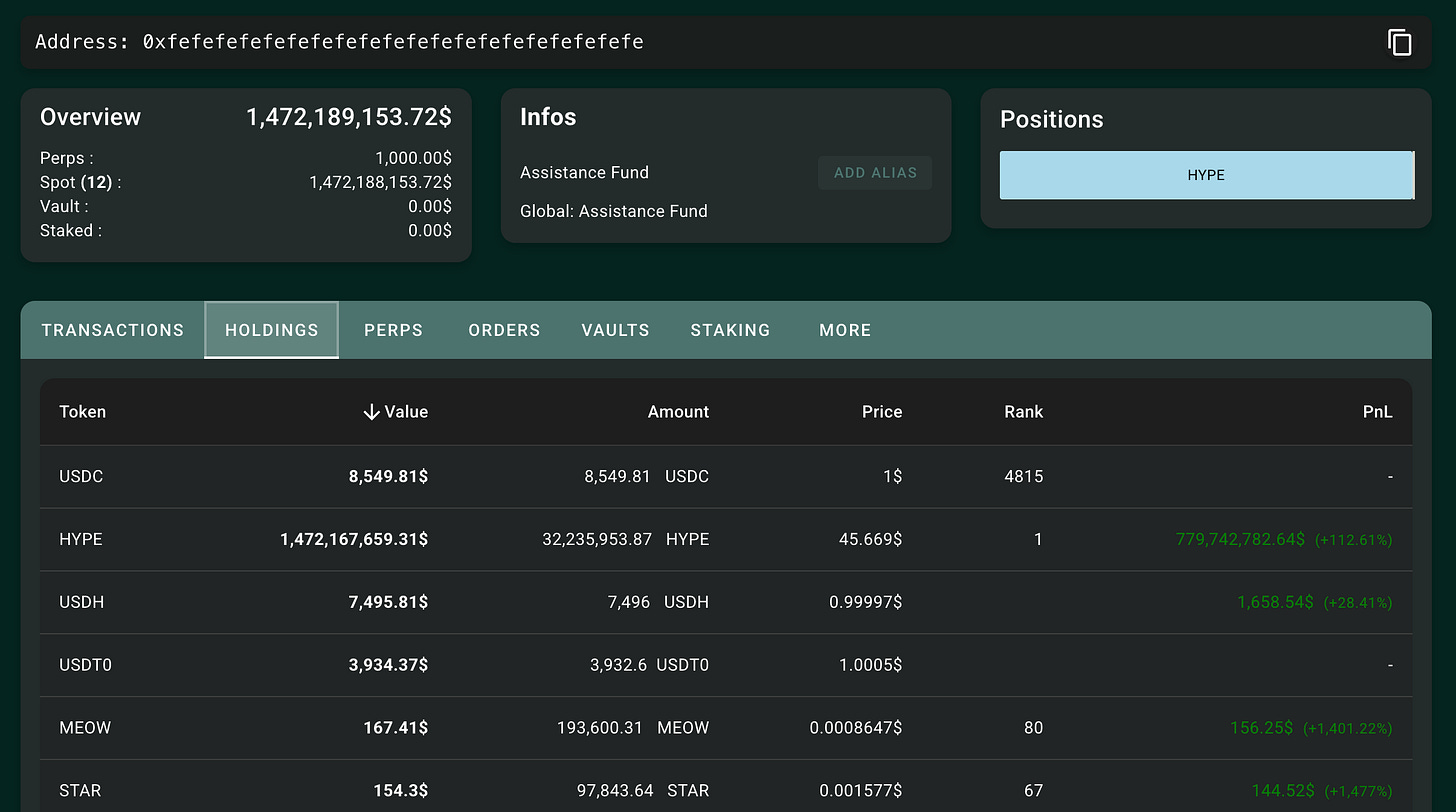 All that said, with success came new challenges—for instance, the FDV (fully diluted valuation) of HYPE soared to ~$45B while the circulating market cap was around $14B, creating an “inflationary illusion” gap. This is because ~421M tokens were still unminted (future emissions) and ~32M in the Assistance Fund were not technically removed, which made FDV look much larger than the actually circulating supply.