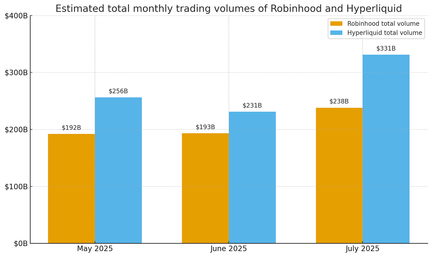 Those early metrics were staggering for such a small operation. Over the 12 months through late 2025, Hyperliquid facilitated about $1.8 trillion in trading volume—over 10% of global crypto perpetual futures activity—with more than 200,000 active users trading each day. Revenue climbed into the hundreds of millions (more on that later). Perhaps most impressively, by July 2025, Hyperliquid’s monthly trading volume (~$330 billion) surpassed Robinhood’s, a traditional retail brokerage, for the third month in a row. It’s a feat that has redefined what a lean startup can do in crypto—Hyperliquid proved that a small, highly focused team can out-build and out-innovate far larger organisations.