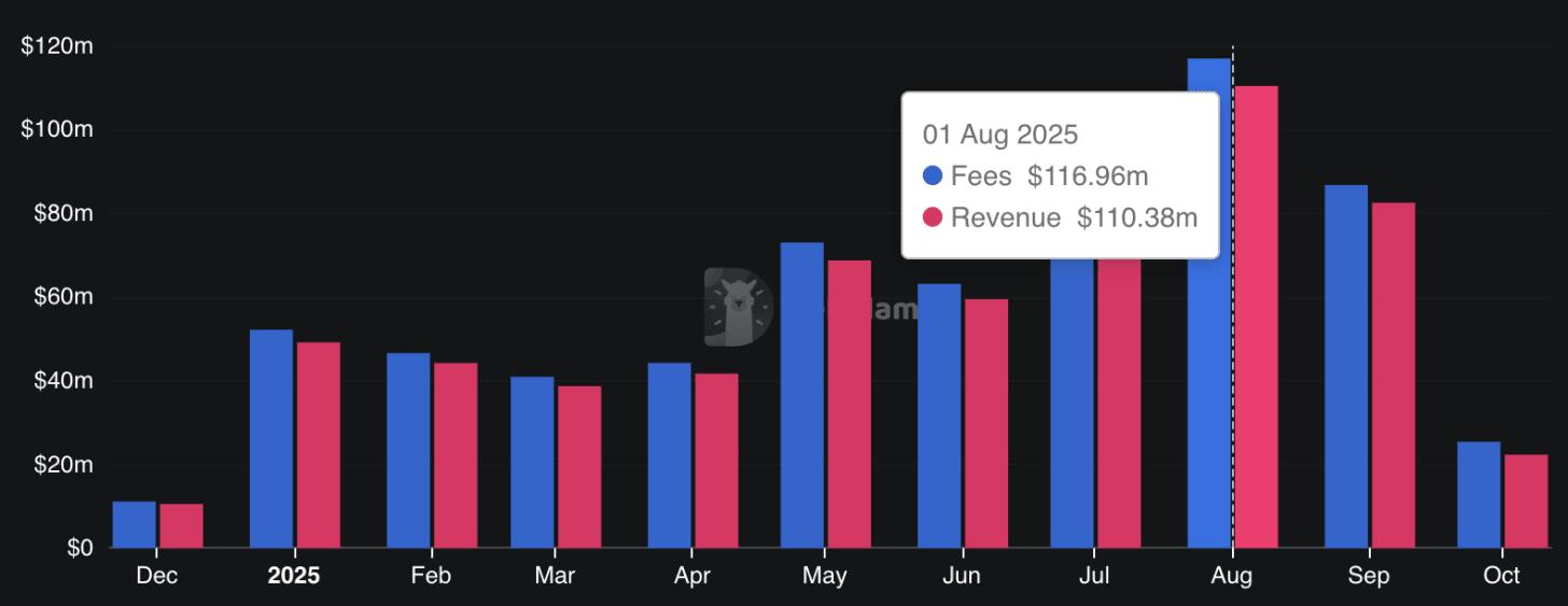 To illustrate Hyperliquid’s growth, consider the images below, which show the platform’s protocol volume and fees over time. It highlights Hyperliquid’s meteoric rise, where monthly volume now consistently surpasses $20B, while generating over $100M in fees—all handled on-chain with sub-second finality.