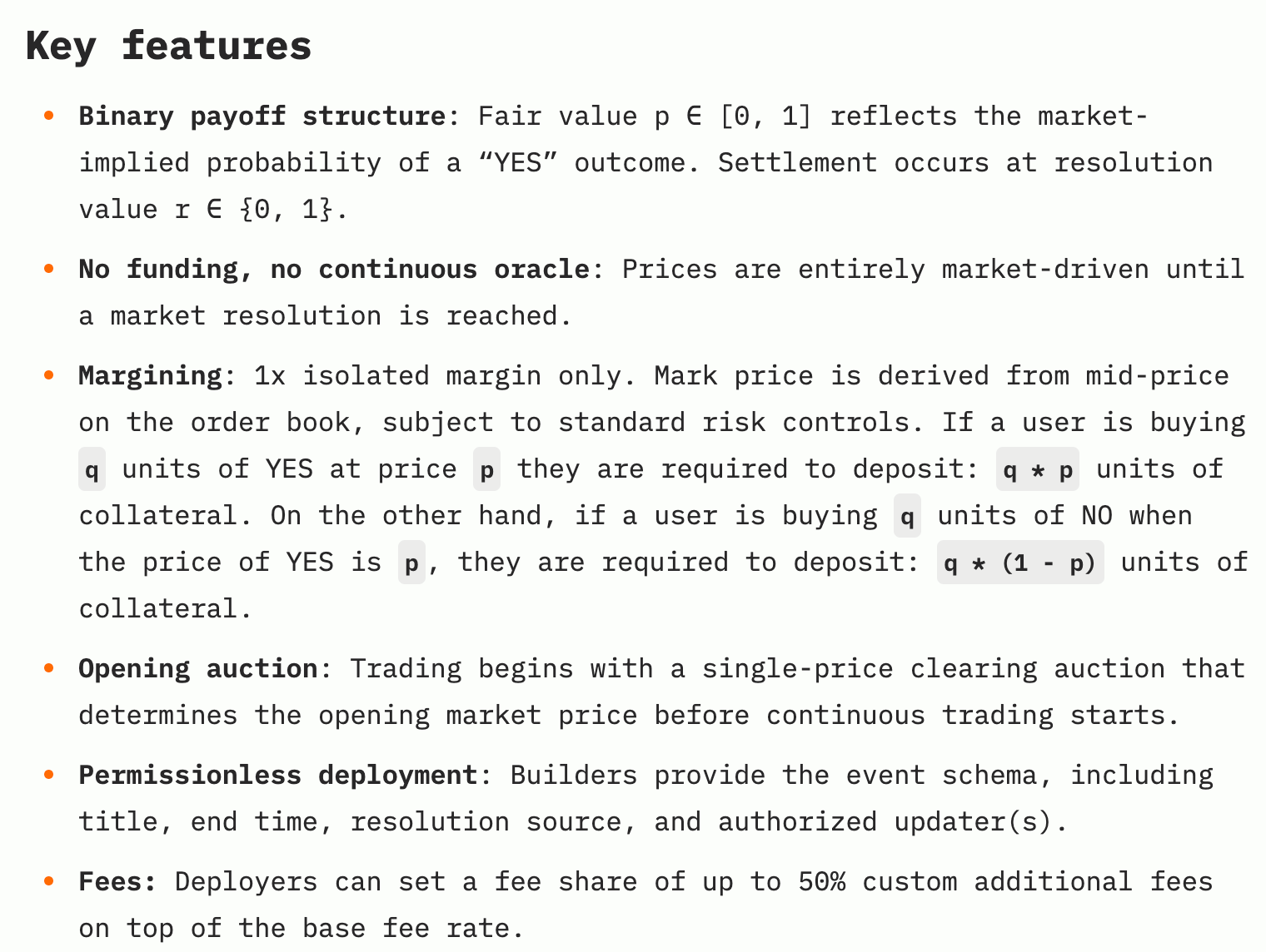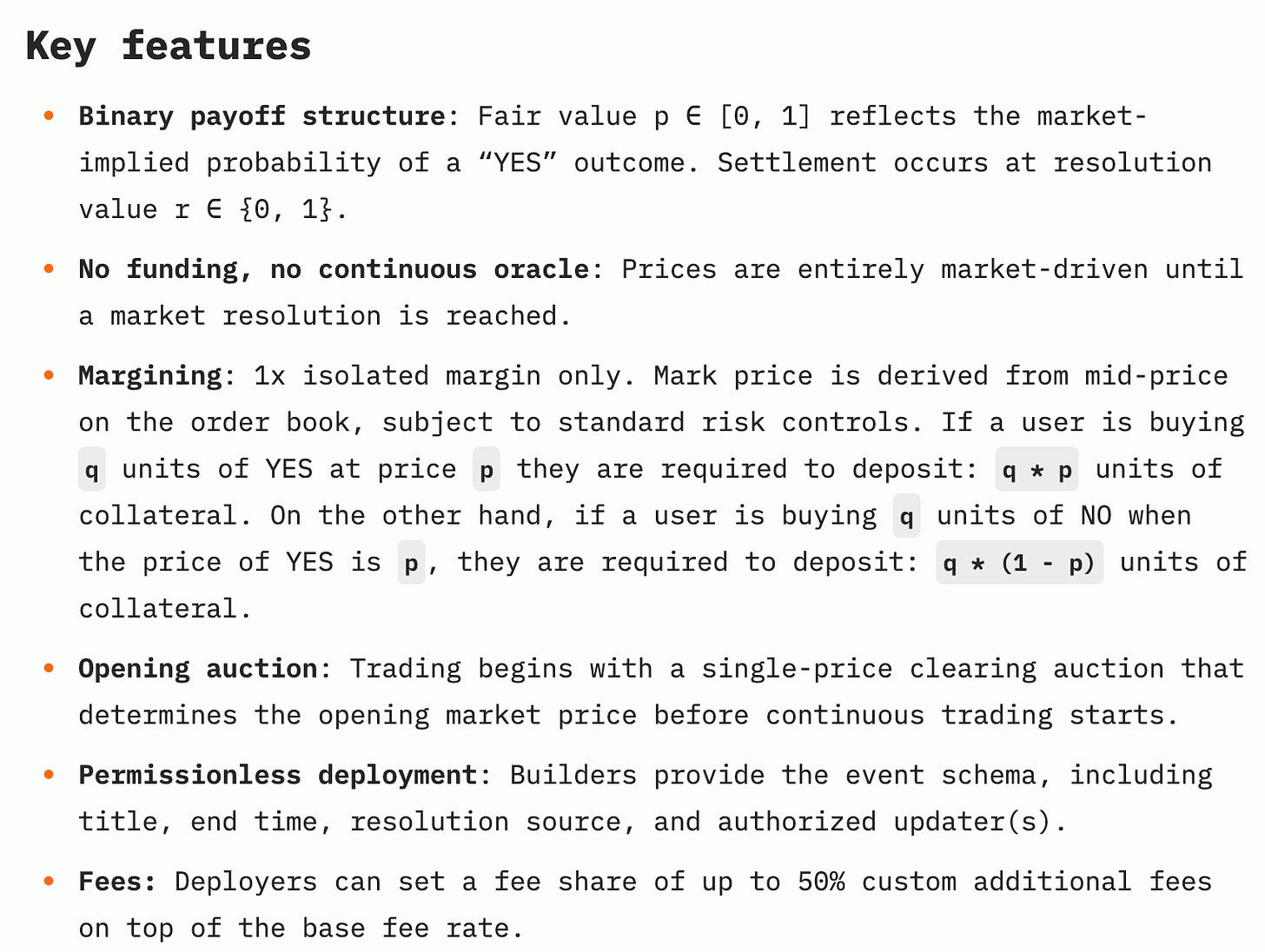 HIP-4: Event Perpetuals (Prediction Markets). This is a recent proposal (Sept 2025) that showcases how community and even external entities are now driving innovation on Hyperliquid. HIP-4, co-authored by members of the community and a head of crypto at Kalshi, proposes “Event Perpetuals”—essentially turning Hyperliquid into a venue for prediction markets like sports bets, election outcomes, etc., using a novel perpetual contract design. The motivation was that traditional perps (with continuous funding and oracle price feeds) aren’t well-suited for binary events. HIP-4 suggests removing oracles and funding for these special markets; instead, they would use trading activity to price the binary outcome, and settle at 0 or 1 based on the event result. An auction mechanism would determine a fair opening price over a 15-minute window before trading commences, addressing the challenge of low-liquidity price discovery.