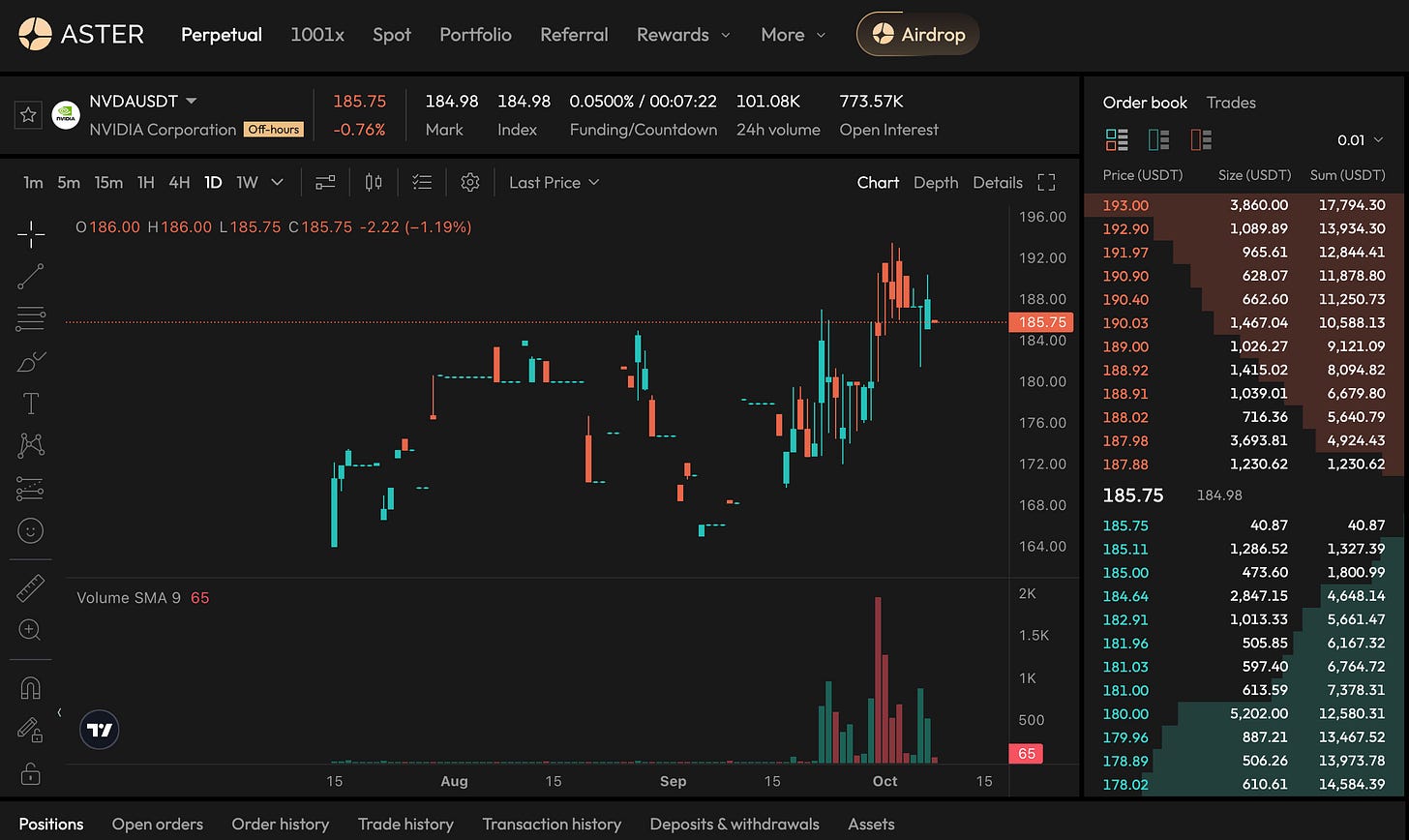 Aster also innovated with stock perpetuals—allowing crypto traders to speculate on stocks like NVIDIA, Apple and Tesla with crypto collateral. This bridging of traditional equities into DeFi is something Hyperliquid hasn’t done (Hyperliquid focuses mainly on crypto assets), and it certainly attracted attention. By October 2025, Aster executed an aggressive liquidity mining campaign (with a points-based trading reward system) that caused its volumes to skyrocket from ~$1B/day to $70B/day within a week. This gave Aster nearly 70% market share by raw volume in early October 2025, temporarily eclipsing Hyperliquid. However, on-chain sleuths suspect much of Aster’s volume was incentivised or even wash-traded to farm rewards—its volume/TVL ratio was an absurd >70, far above normal, hinting the growth wasn’t purely organic. Still, Aster has positioned itself as a serious contender, backed by endorsements from notable figures like Binance’s CZ. Aster shows that the competition is not standing still; features like MEV-protected trading, multi-chain accessibility, and unique markets (stock perps) are being tried to one-up Hyperliquid.