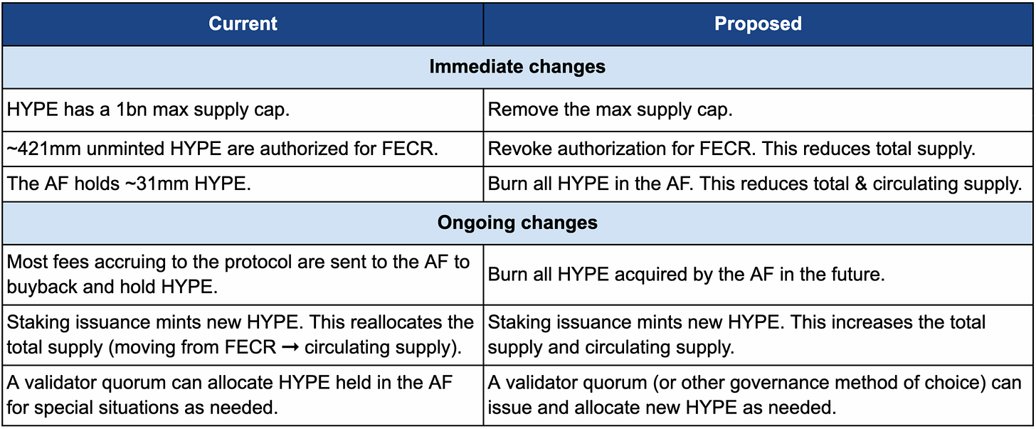 To address this perception (and the impending unlock of team tokens), a dramatic proposal was introduced in September 2025: cut HYPE’s total supply by 45%. Crypto asset manager DBA and researcher Hasu co-authored a plan to burn 452 million HYPE tokens that were not in circulation. Specifically, they suggested permanently revoking the 421M unminted community reward tokens and the 32M tokens held by the Assistance Fund (since those had accumulated as bought-back reserves). This would eliminate those tokens from the supply, thereby aligning the max supply closer to the current circulating amount. It would also remove the notional 1 billion cap, giving flexibility to reintroduce incentives later if needed (via governance) without confusing the accounting.